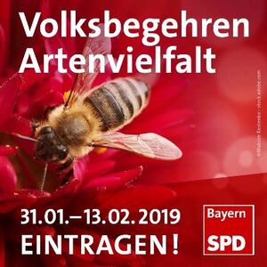 Nun ist in Bayern ein Volksbegehren zum Schutz der Artenvielfalt in Gang gekommen, initiiert von der ÖDP, unterstützt von Bündnis 90/ Die Grünen, dem Bund Naturschutz und einigen anderen Initiativen, unter dem Titel "Rettet die Bienen, stoppt den Artenschwund!". Vor allem der Einsatz von Pestiziden steht in der Kritik – es gibt auch ein Thesenpapier der Bayern-SPD, die sich dieser Bewegung angeschlossen hat und gleichfalls dazu auffordert, sich in der Zeit von 31. Januar bis 13. Februar 2019 in die in den Rathäusern ausgelegten Listen einzutragen (Ausweis mitnehmen!). Fast alle Kommunen haben dazu die Öffnungszeiten ausgeweitet (siehe Information der Stadt Bamberg weiter unten).