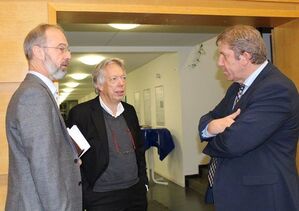 Es herrschte eine lockere Atmosphäre: Hinter den Pult wollte sich Rossmann nicht stellen. Schließlich sei er "nicht da, um eine Vorlesung zu halten, sondern um zu diskutieren und Meinungen zu hören", betonte der promovierte Sportwissenschaftler. Neben zahlreichen Studierenden fanden unter anderem auch der Sprecher der Bamberg Graduate School of Social Sciences, Prof. Thomas Saalfeld (links im Bild), sowie der Bamberger SPD-Bundestagsabgeordnete, Andreas Schwarz (rechts), den Weg in die Feki-Uni.